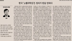 '방가조선일보' 양상훈 주필이 10월 22일에 ‘한국 '노벨의학상'은 정치가 받을 만하다’라는 제목으로 칼럼을 썼다. 그야말로 발칙한 주장이 아닐 수 없다. 한국 정치가 정치적으로 죽은 자를 살려내는 재주가 있다며 비아냥거리는 짓이다. 양 씨는 본인 말이 아니라며 따옴표를 썼으니 그를 탓할 일은 아닌 듯도 하다. 다만 방가조선일보가 노골적으로 보여주는 일본 바라기 행태는 지적하고 싶다. 일본 과학자가 노벨생리의학상과 화학상을 받은 사실은 분명 축하할 일이다. 아무리 그래도 ‘일본의 저력은 우리가 범접하기 어려울 정도로 깊고도 넓다’