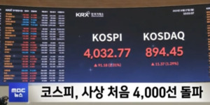 파죽지세 주가 상승...연내 5천 달성도 가능할 듯연합인포맥스와 한국거래소에 따르면 지난 27일 코스피는 전장보다 101.24포인트(2.57%) 오른 4,042.83으로 장을 마감했다. 종가 및 장중 기준 코스피가 4,000선을 돌파한 것은 이번이 처음이다. 물론 28일 지수가 밀리긴 했지만 4,010선은 사수했다.코스피의 연초 이후 상승률은 무려 68.49%다. 주요 20개국(G20)의 주가 지수 가운데 가장 최근 거래일 종가 기준 60%대의 상승률을 보인 곳은 없다. 2위인 일본의 닛케이225 평균주가의 수익률이 이날 기준 26