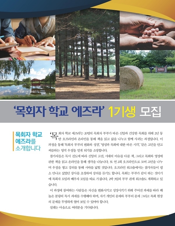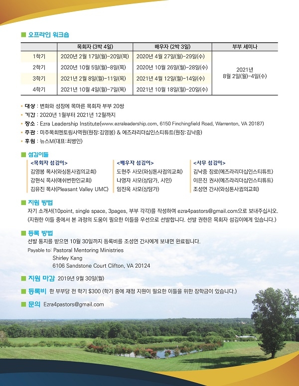 지원 방법은 자기 소개서를 작성하여 9월 30일(월)까지 ezra4pastors@gmail.com으로로 보내면 된다. 세부 사항은 아래 팜플렛에 나와 있다.