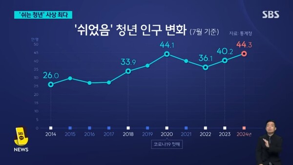 청년층 인구는 줄어드는데 쉬는 청년은 늘면서 그 비중은 역대 최고 수준으로 나타났다. 지난달 청년층 인구 815만명 가운데 쉬었음 청년(44만3천명)이 차지하는 비중은 5.4%였다. 7월 기준 가장 많은 수준이다.