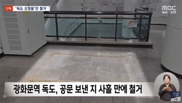 그런데도 서울시 교통공사는 몰래 조형물을 철거했다가 뒤늦게 온라인 커뮤니티 등에서 논란이 되면서 들통났다. 백호 사장은 "시민 안전 확보 차원에서 철거를 결정했다"고 해명하고 10월 독도의 날에 벽면 독도 조형물을 재설치하겠다고 했지만, 여전히 석연치 않은 구석이 많다.