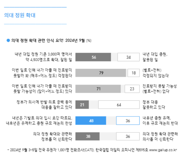 의대 증원에 대한 긍정론은 여전히 우세하지만, 의대 증원에 반발하는 의사계와 의료 공백 등에 관한 정부 대응에 대한 평가에서는 '잘하고 있다'가 21%에 불과한 것으로 나타났다, '잘못하고 있다' 64%, 의견 유보 15%. 긍정론은 의대 증원 계획 발표 초기인 지난 3월 38%에서 9월 21%로 줄었고, 같은 기간 부정론은 49%에서 64%로 늘었다. 특히 내년 의대 증원 긍정론자(563명), 성향 보수층 중에서도 절반 가량이 정부가 대응을 잘못하고 있다고 봤다.