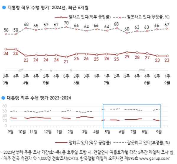 한편 한국갤럽의 이번 윤석열 대통령의 직무 수행에 대한 평가 조사에서는 23% 긍정 평가로 지난 8월 5주차 조사와 같았다. 부정 평가만 지난주 보다 1% 오른 67%였고 그 외는 의견을 유보했다(어느 쪽도 아님 4%, 모름/응답거절 6%). 윤 대통령이 현재 '잘하고 있다'는 응답은 국민의힘 지지자(57%)에서만 두드러지며, 70대 이상, 성향 보수층에서는 긍·부정률이 각각 40%대로 비슷하게 갈렸다.