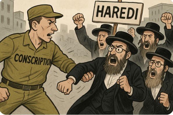 이스라엘방위군(IDF)은 최근 하레디 남성 5만 4000명에게 징집 명령을 발송할 계획을 발표했다. 징집 기피자를 단속하기 위한 검문소 설치와 강제 연행 계획도 공개되며 정부의 강경한 입장이 드러났다. 이는 2024년 6월 대법원이 “하레디 병역 면제는 위헌”이라며 징집 의무화를 최종 판결한 데 따른 후속 조치다. 그러나 하레디 공동체는 “토라 공부가 국가에 대한 최고의 기여”라며 징집을 거부, 예루살렘과 텔아비브 거리에서 대규모 시위를 벌이고 있다. 일부 시위대는 고속도로 점거와 국기 훼손 등 강경 행동으로 반발하며 갈등이 최고조에 달하고 있다.